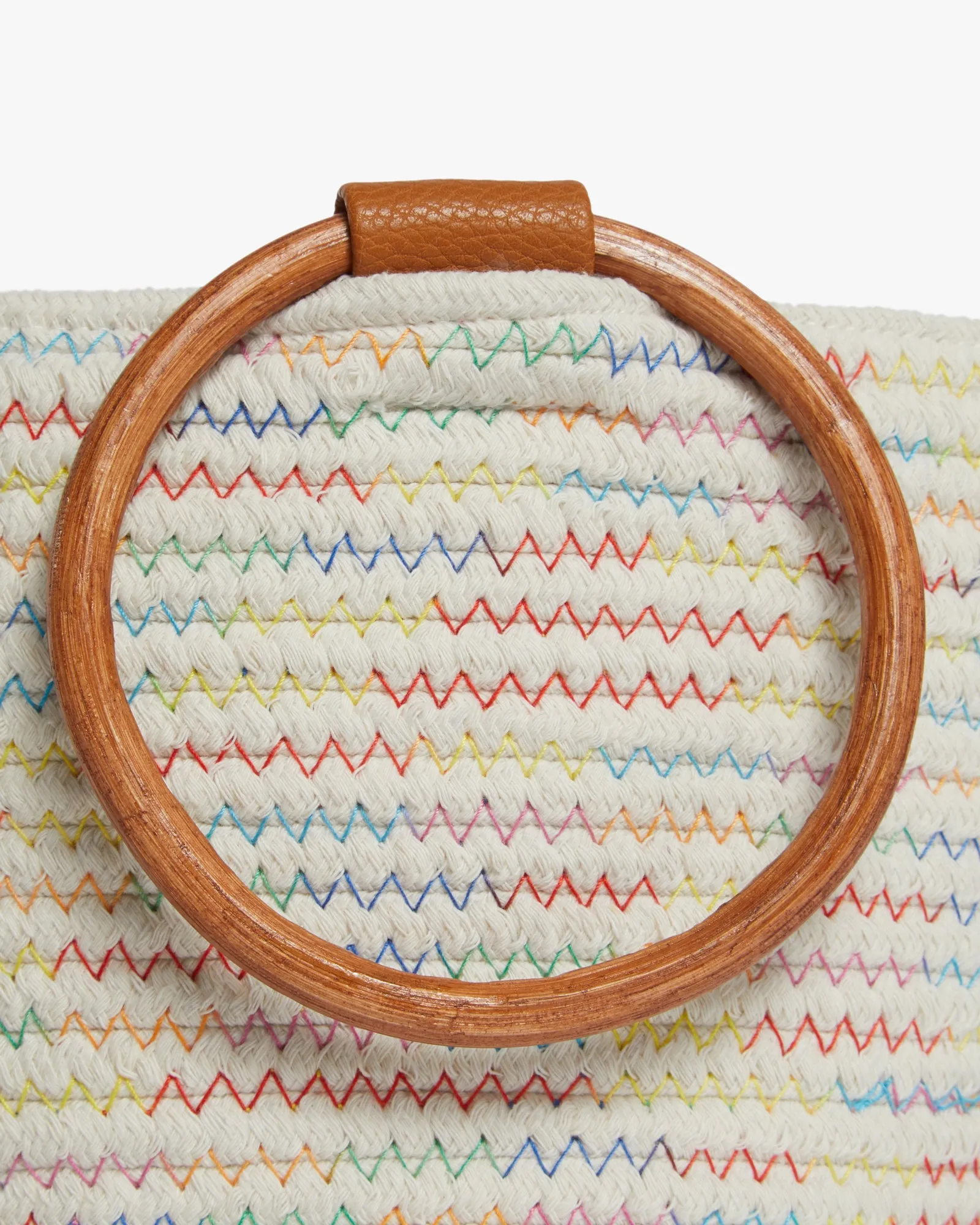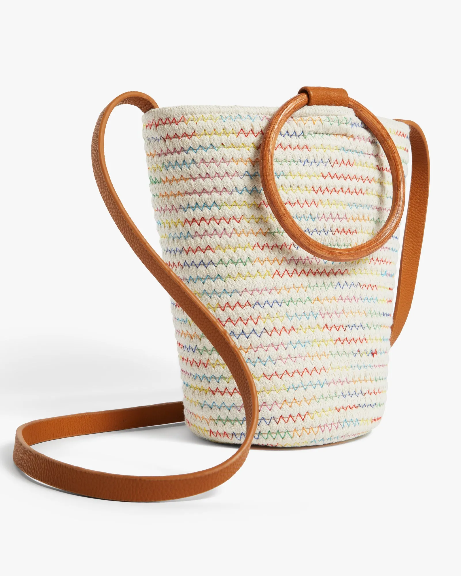 Bring a chic tropical vibe to your everyday wardrobe with this ultra-chic bucket bag. Rendered from crochet and embroidered with a colorful zig-zag pattern, it goes with everything in your wardrobe. Carry it by the circular top handle (so cute), or go hands-free and wear it as a crossbody.